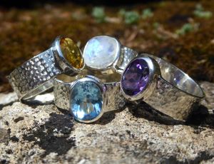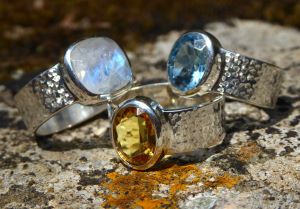 bague avec differentes pierres : topaze bleu, citrine, amethyste, quartz fume, pierre de lune