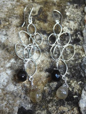 boucles d’oreille argent, pierre quartz fume et rutile quartz