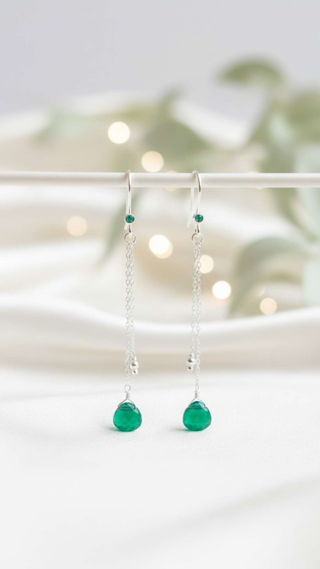 De délicates boucles d’oreilles longues en argent, sublimées par une fine chaînette qui effleure le cou avec élégance et ornées de pierres d’onyx vertes. Leur design aérien capte la lumière à chaque mouvement, offrant une allure à la fois moderne et raffinée, parfaite pour rehausser discrètement chaque tenue.