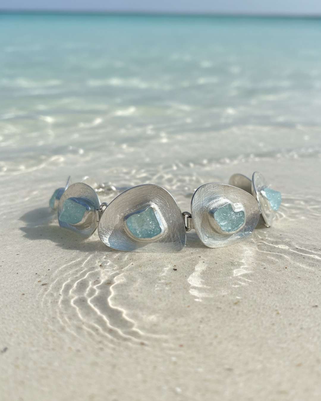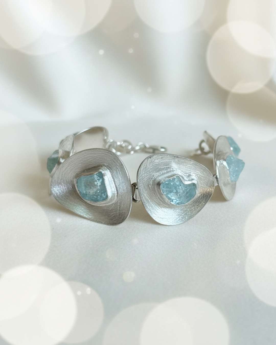 Bracelet en argent fait main, orné de pierres d’apatite bleue brutes aux reflets océaniques, un bijou authentique qui allie élégance naturelle et douce énergie apaisante.
