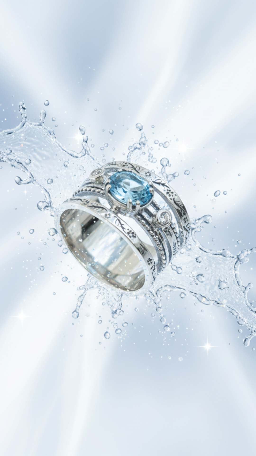 Une bague ouvragée sublimée par une topaze bleue éclatante, aux reflets cristallins. Un bijou raffiné et intemporel, alliant finesse artisanale et élégance lumineuse.